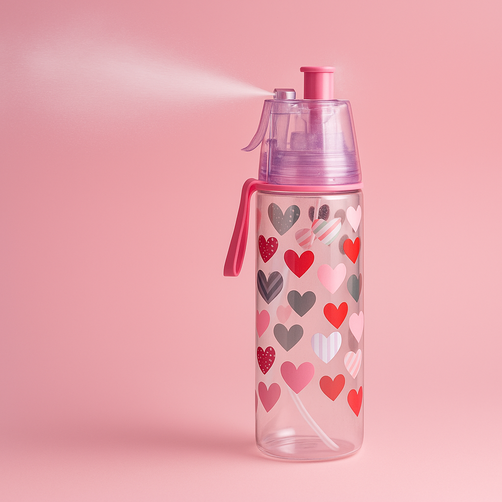Esta botella spray con diseño de corazones es perfecta para hidratarte y refrescarte en cualquier momento. Ideal para días de calor, actividades al aire libre, gimnasio, playa o simplemente para llevar en tu bolso.