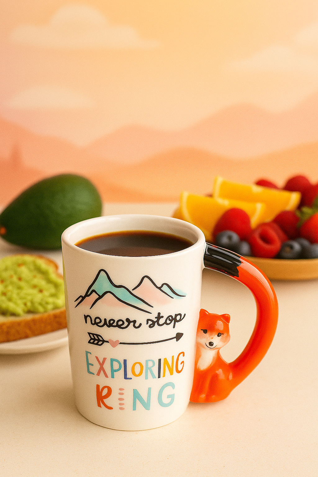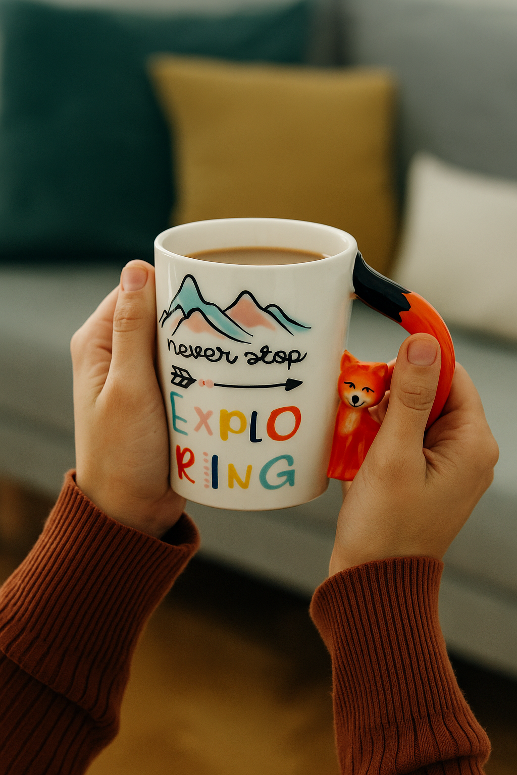 Empieza tus mañanas con energía y espíritu explorador con esta adorable taza de cerámica. Su diseño colorido con montañas y el mensaje “Never Stop Exploring” te recordará cada día que el mundo está lleno de nuevas aventuras. El detalle del pequeño zorro en el asa le da un toque único y tierno, ideal para regalar o disfrutar en casa.