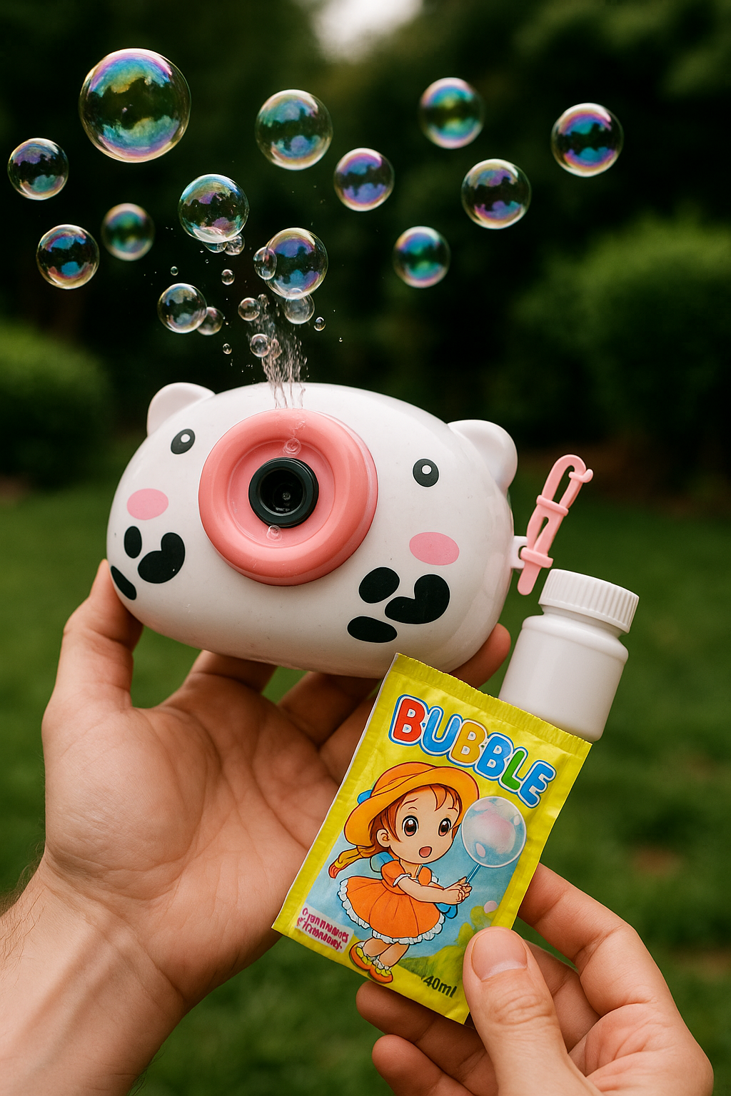 Su forma de animalito y sus burbujas infinitas la convierten en el accesorio perfecto para juegos al aire libre, fotos soñadas y regalos inolvidables.