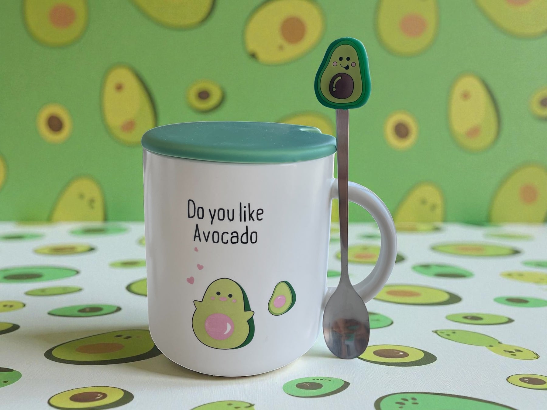 Cada taza está hecha con cerámica de alta calidad, tapa verde pastel y cucharita con detalle de palta — perfecta para regalar o coleccionar.