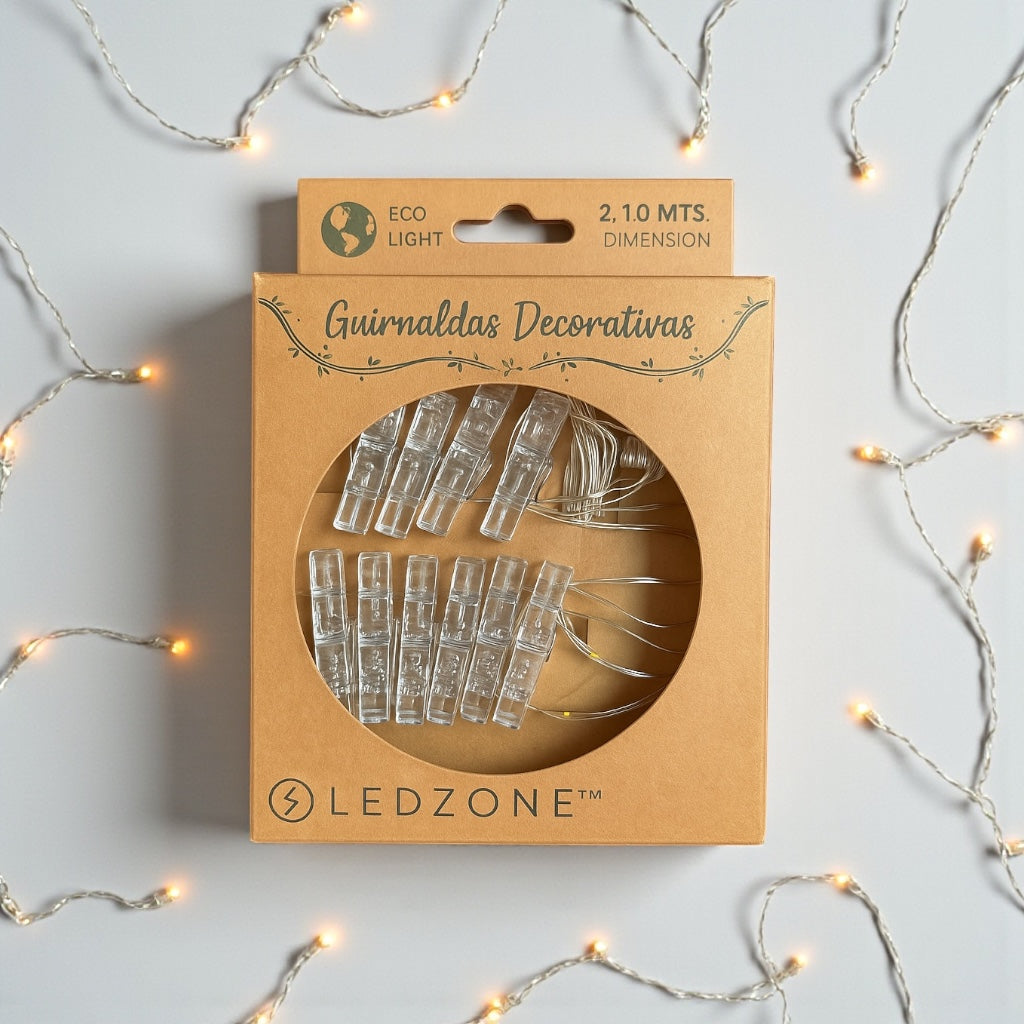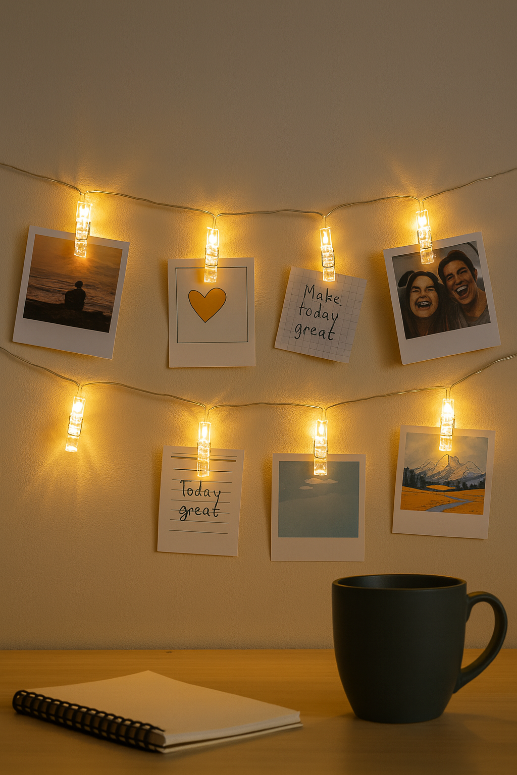 Nuestra guirnalda decorativa de luces LED con clips transparentes es ideal para colgar fotos, recuerdos, postales o mensajes, creando una atmósfera acogedora y estética en cualquier rincón.