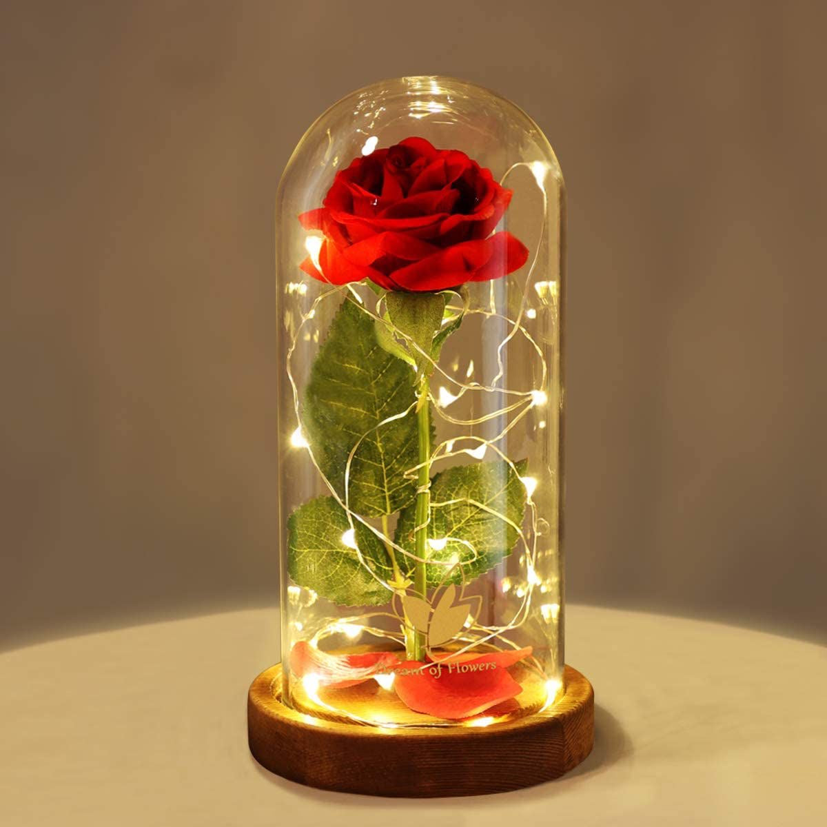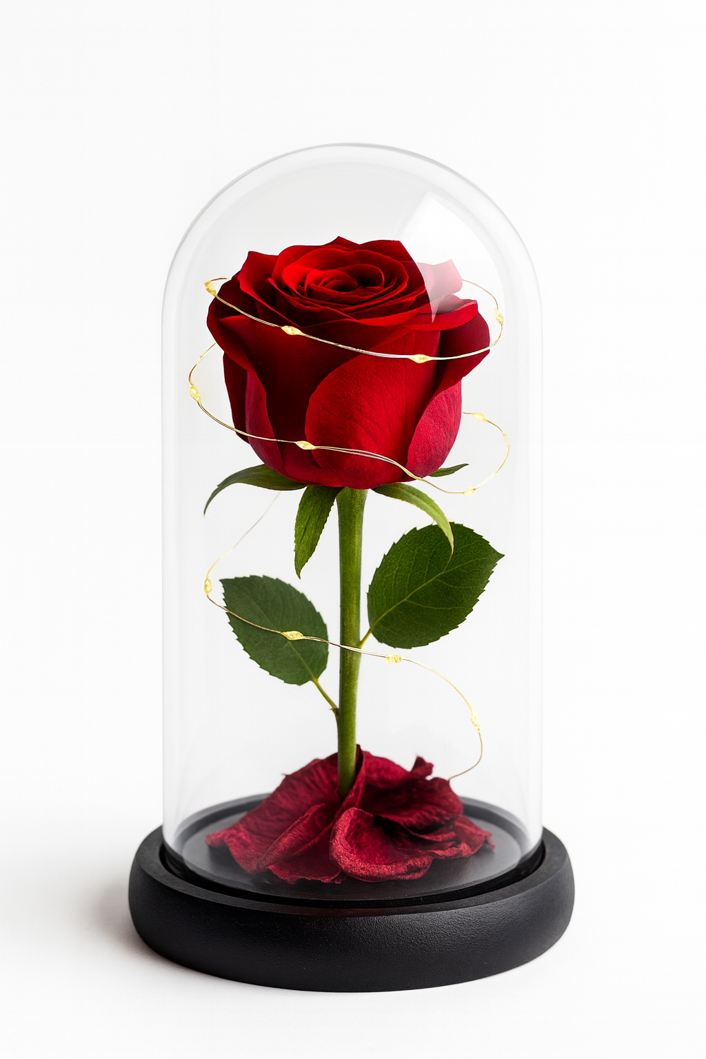 Esta rosa eterna con luz LED, protegida en una delicada cúpula de cristal, simboliza el amor eterno, la belleza y los momentos que quieres conservar para siempre.