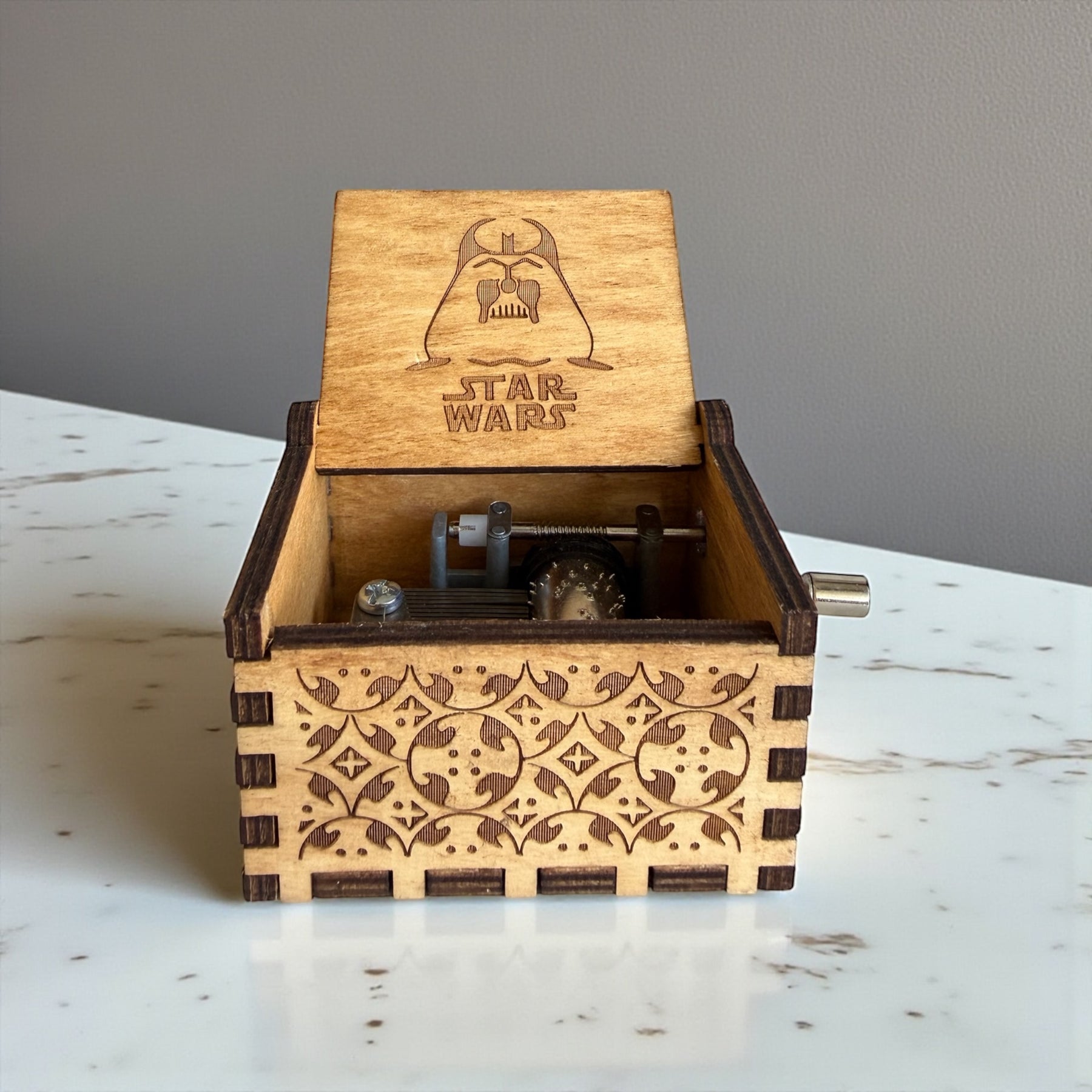 Al girar la manivela, el mecanismo interno reproduce una melodía clásica mientras el diseño grabado láser con detalles inspirados en el universo galáctico le da un toque elegante y coleccionable.