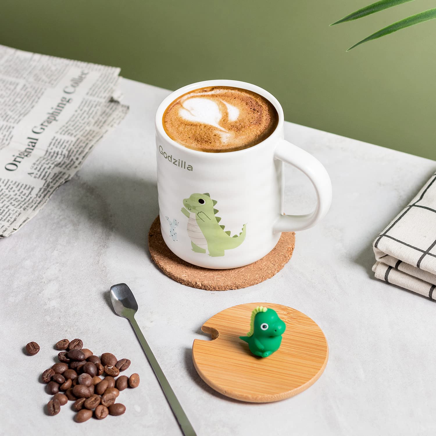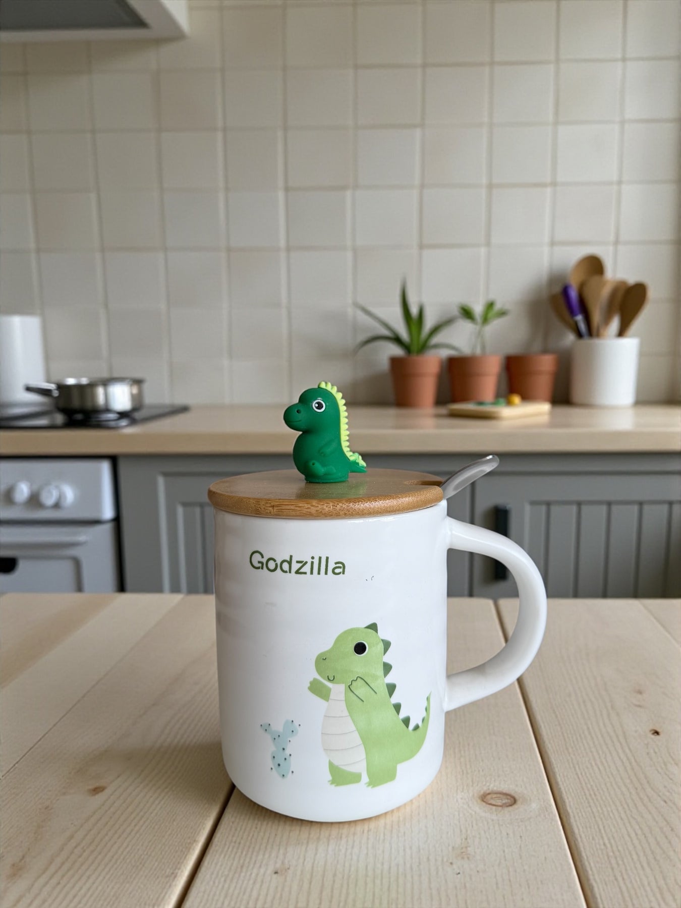 Su diseño encantador incluye ilustración de dinosaurio y tapa de bambú natural con figura decorativa en relieve, perfecta para niños y amantes de los dinos.