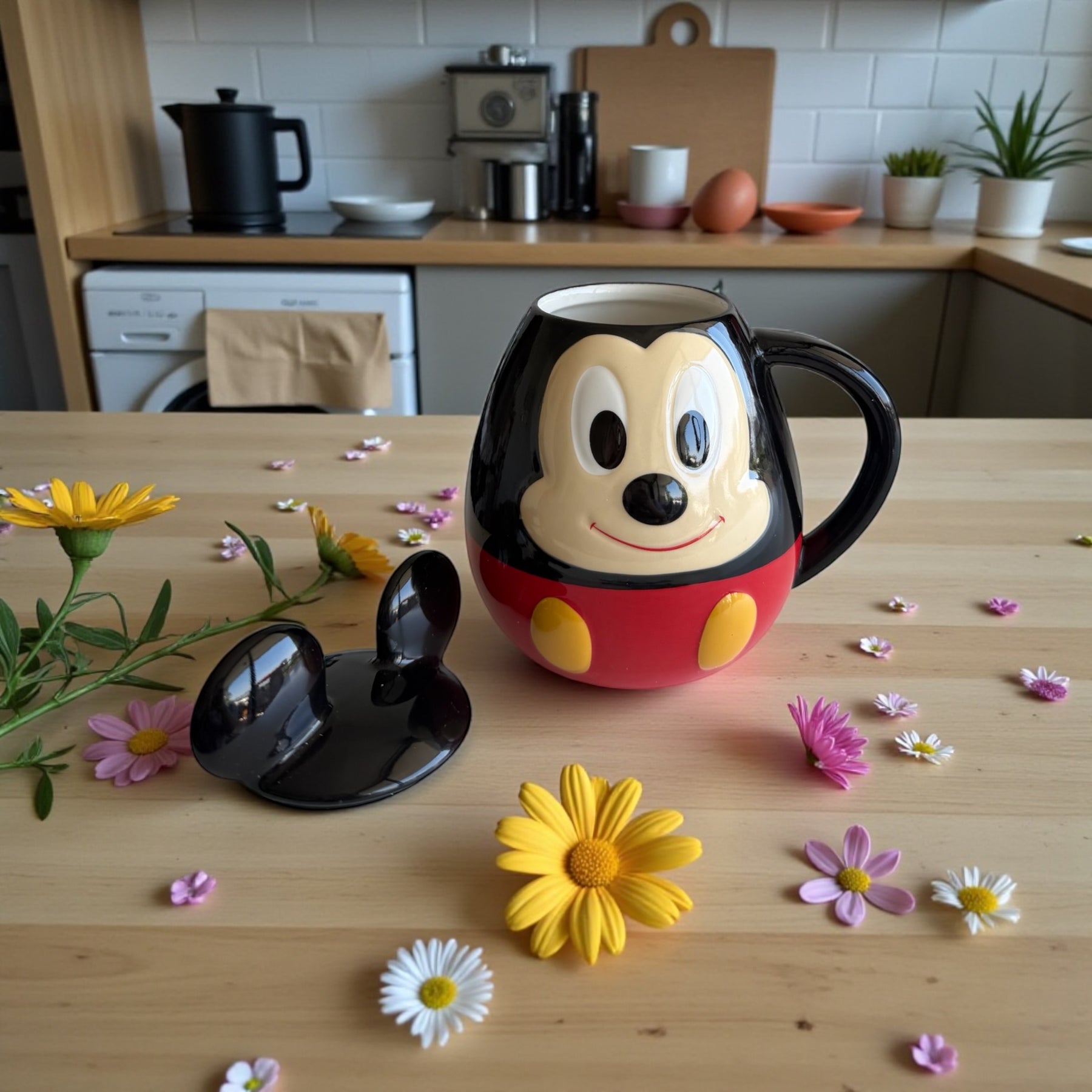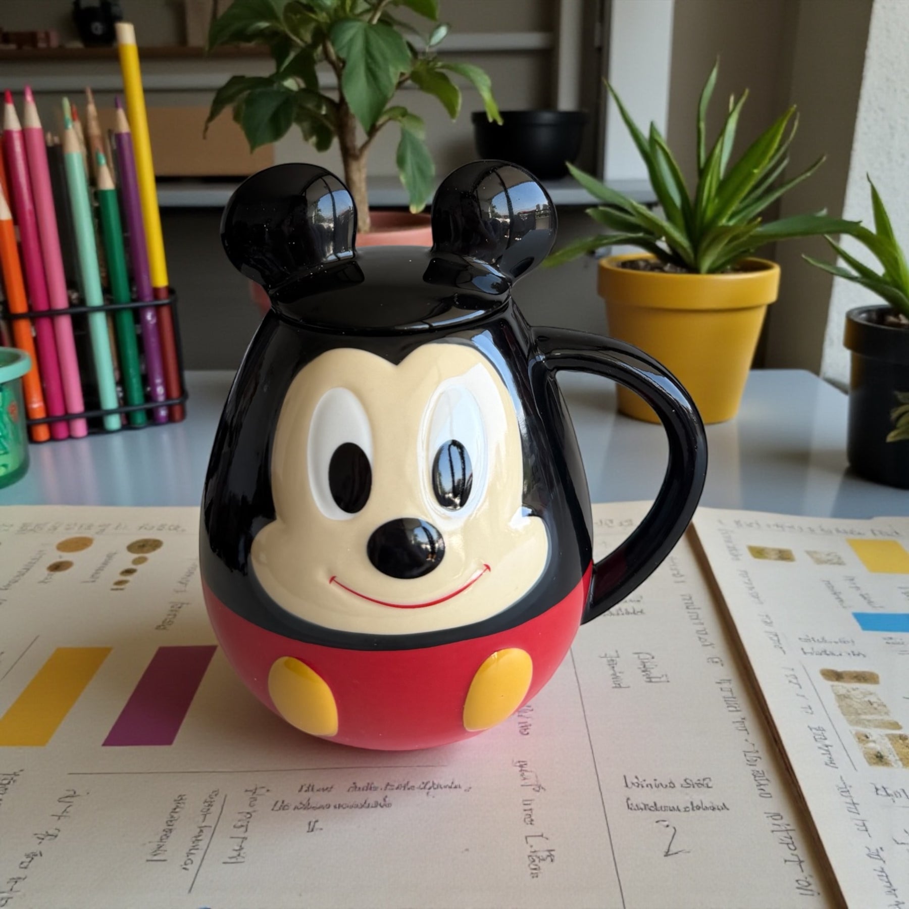 Su diseño envolvente en colores clásicos negro, rojo y amarillo la convierte en una pieza llamativa y perfecta para fans de Disney que buscan algo más que una taza tradicional.